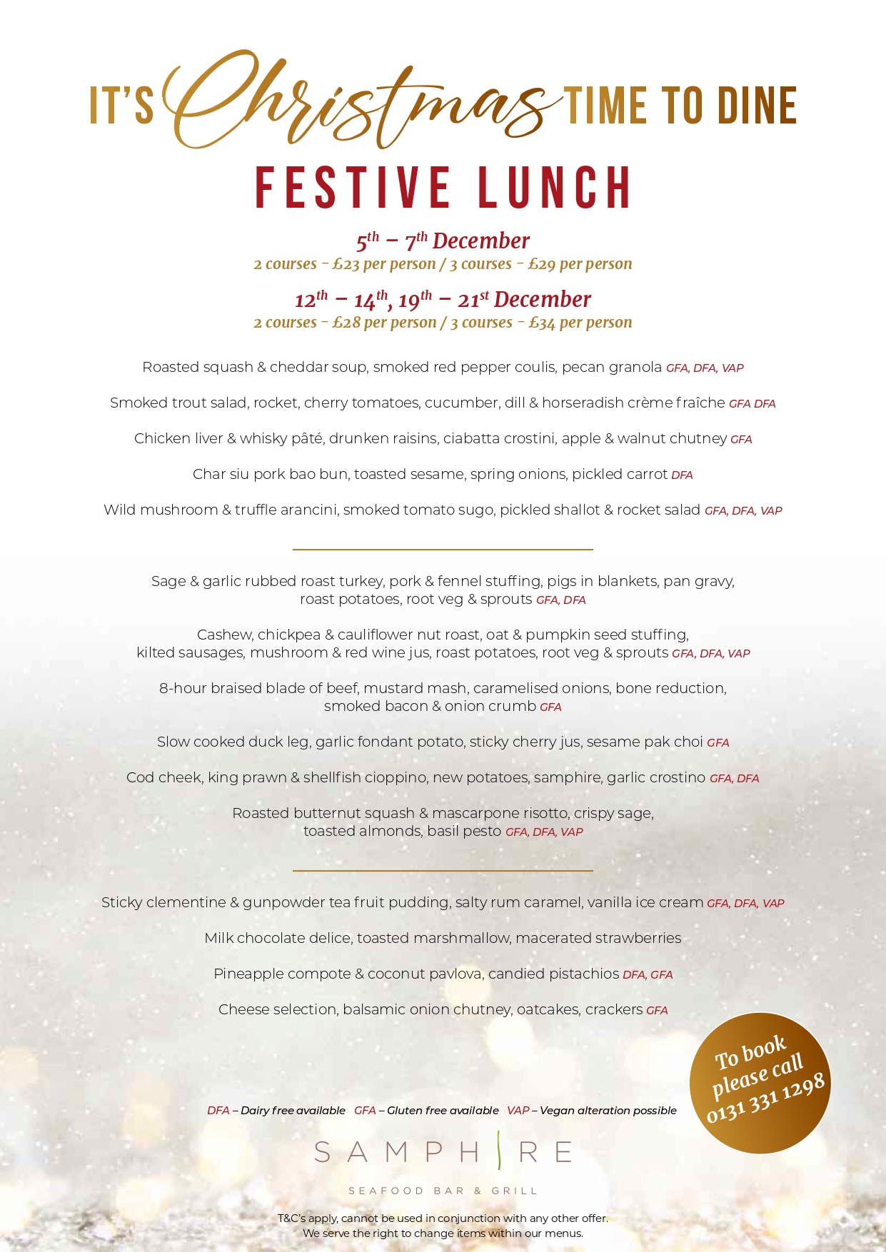 Our relaxed waterfront restaurant serves the finest seafood and grilled meats, each with a festive twist. From casual daytime dining to elegant evening feasts, Samphire offers festive options to suit every occasion.