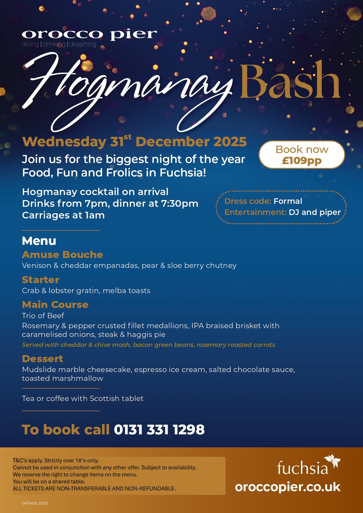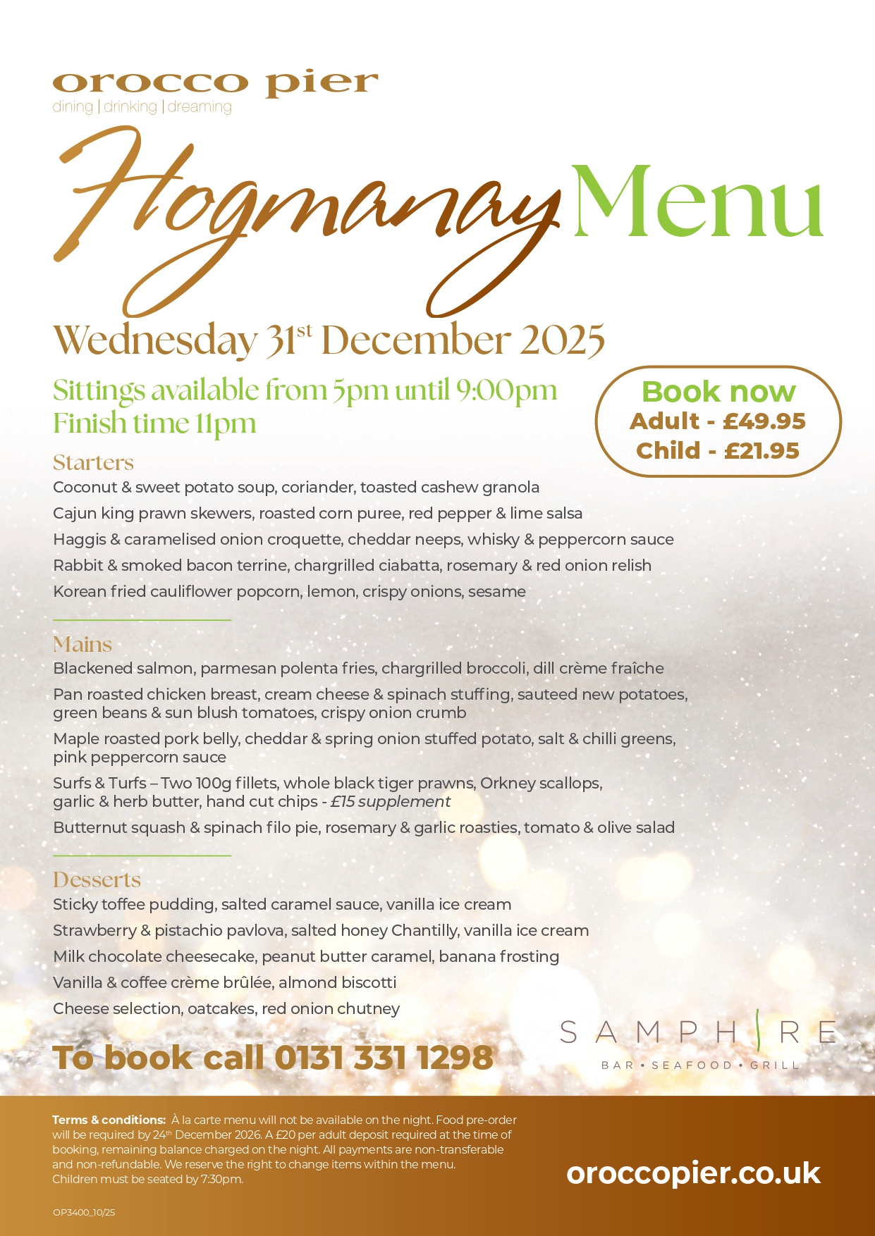 Enjoy a scrumptious Hogmanay meal served in Samphire Seafood Bar & Grill from 5pm until 9pm. Closes at 11pm.