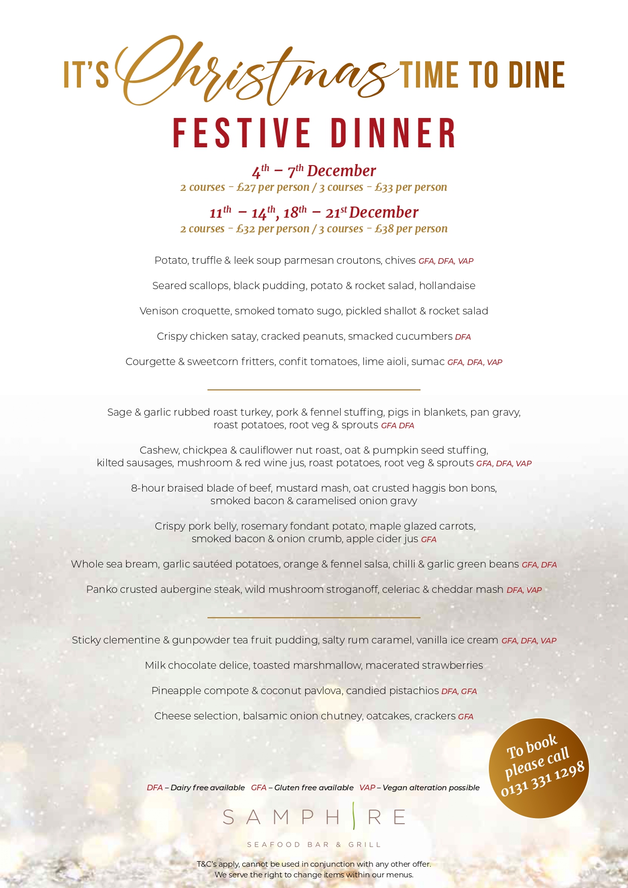 Enjoy festive dining within Samphire for 30 guests. Includes is a semi-private area, glass of prosecco each on arrival, novelties and a 3-course festive meal.